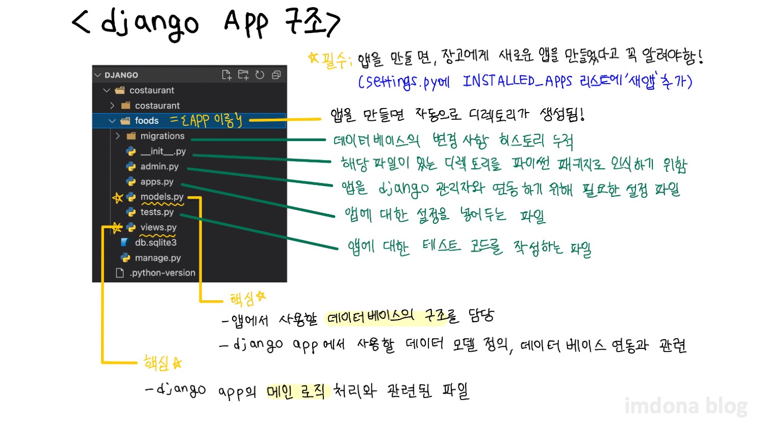 - views.py : django app์ ๋ฉ์ธ ๋ก์ง ์ฒ๋ฆฌ์ ๊ด๋ จ๋ ํ์ผ (ํต์ฌ)